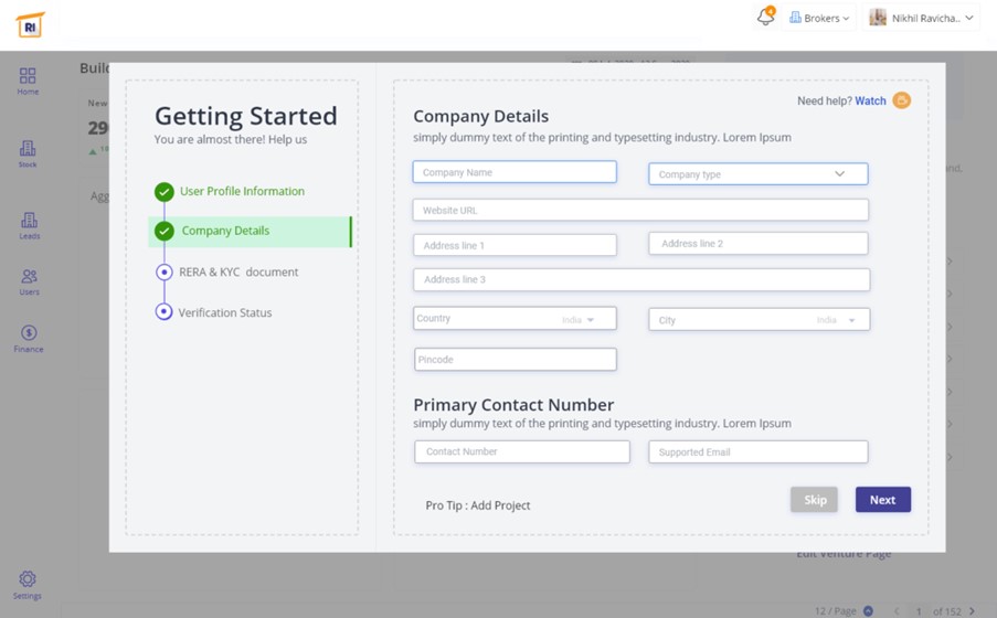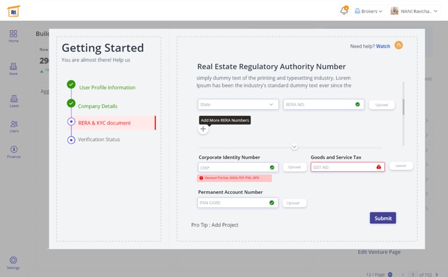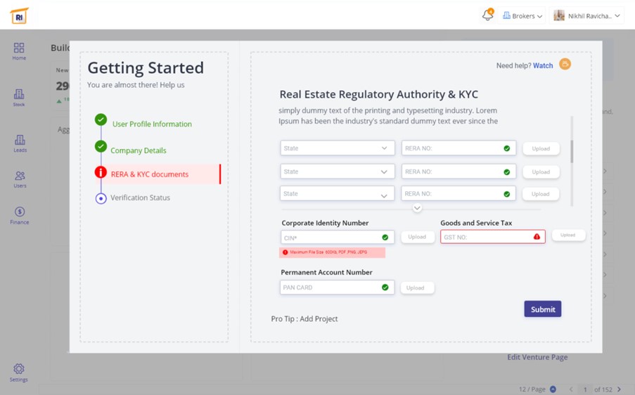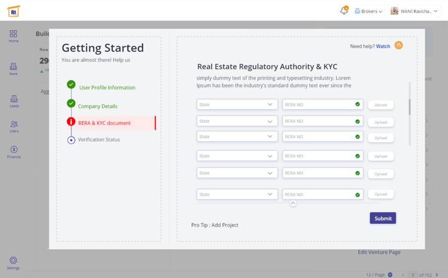 You have now reached the third step of the sign-up process where you have to upload your Real Estate Regulatory Authority (RERA) & Know Your Customer (KYC) documents and get them verified.