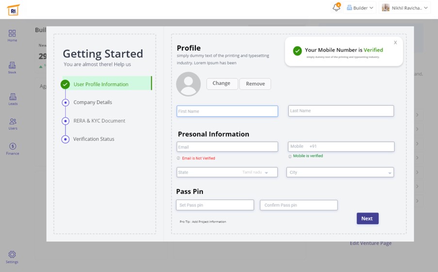 If you have selected the account type as “Builder” while filling the “sign up” form, you will see the following screen on your web browser.