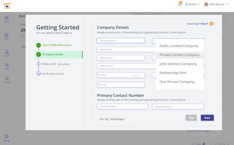 If you still have doubts and want to collect more data before completing the ‘company details’ form, you can skip this step temporarily and come back to the form later by pressing the ‘skip’ button.