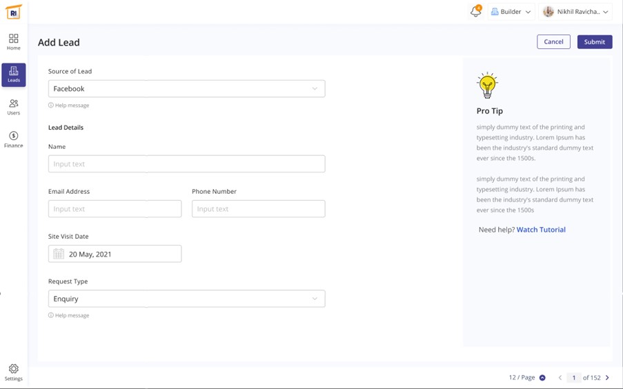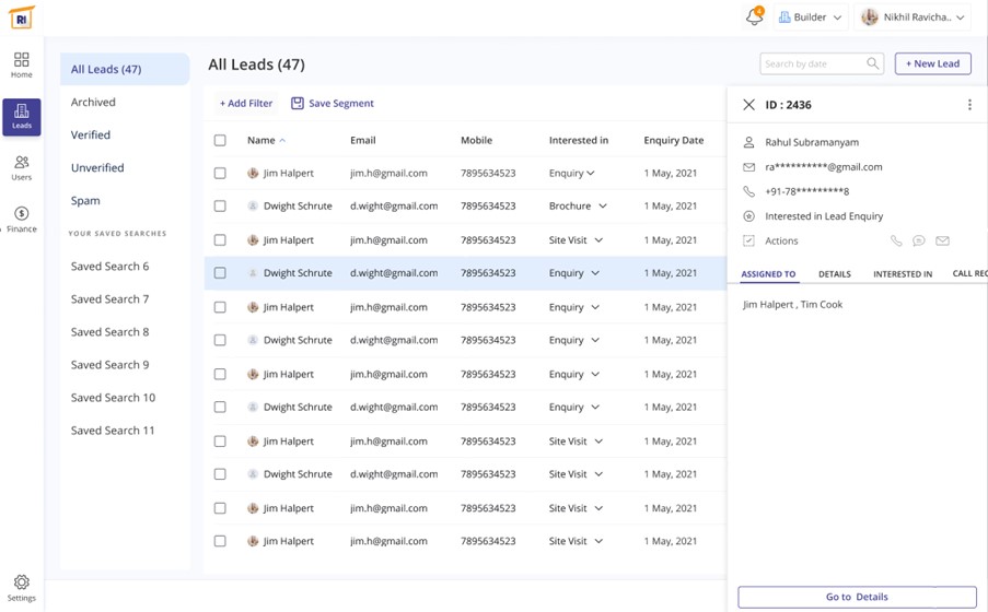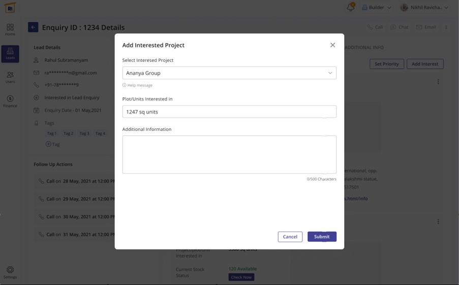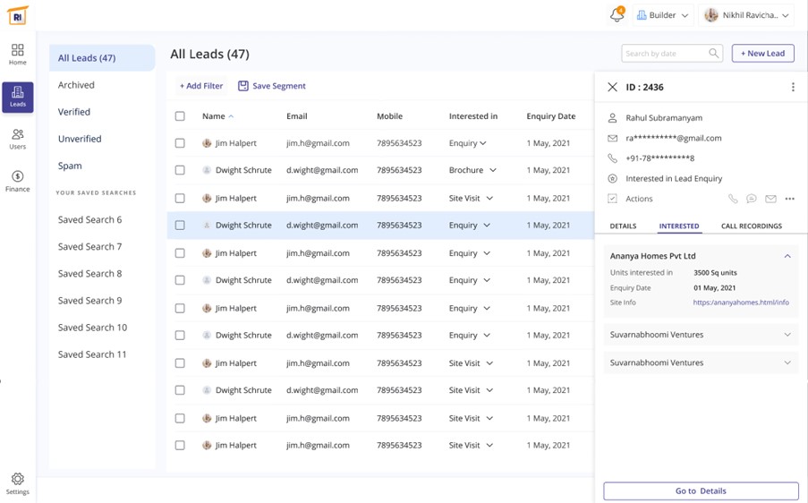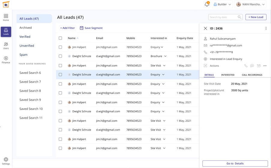 • My Leads section of the software acts like a CRM (Client Relation Management) tool for the builders.