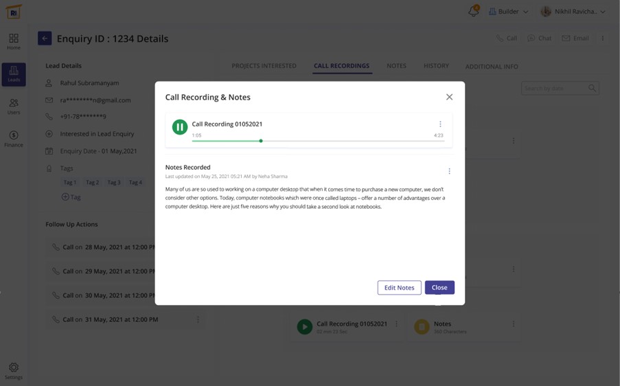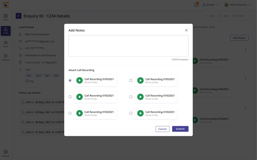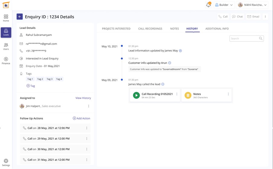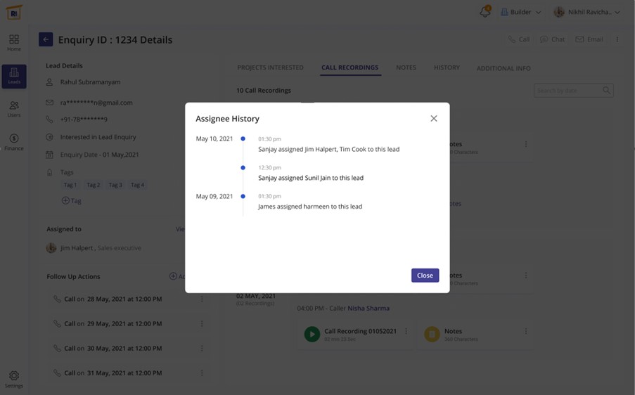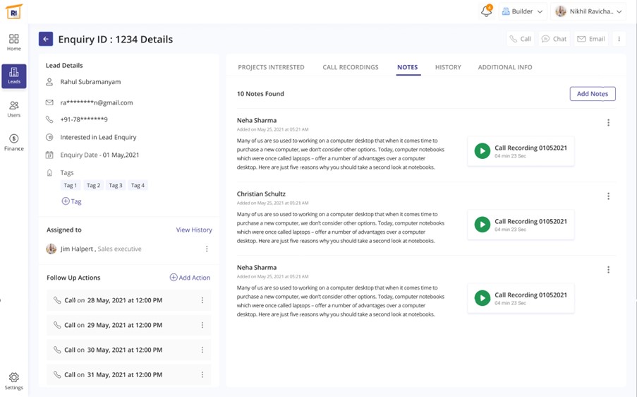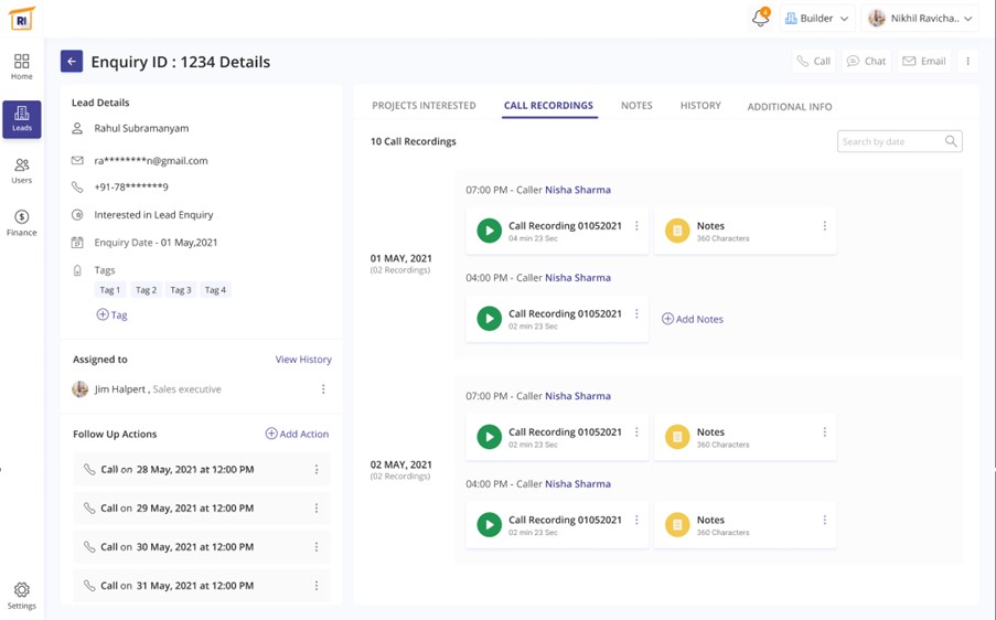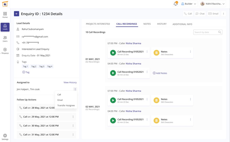 • The broker can call, text, or email the lead directly from the platform. The builder can also access the call recordings and discussions done with the lead if the broker-in-charge has granted access to the same.