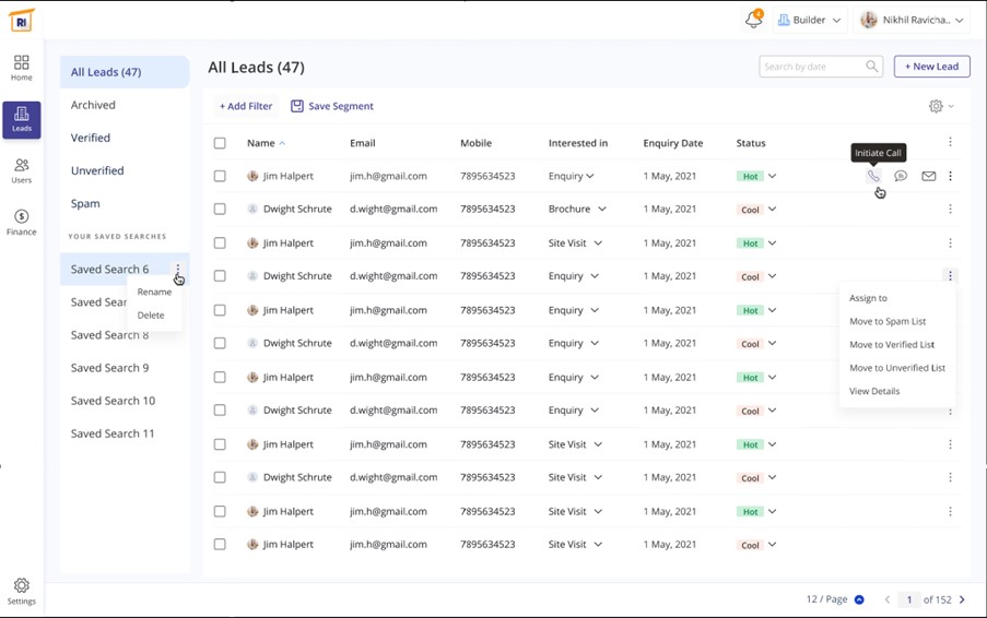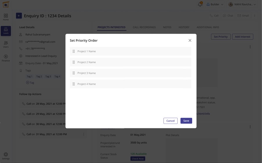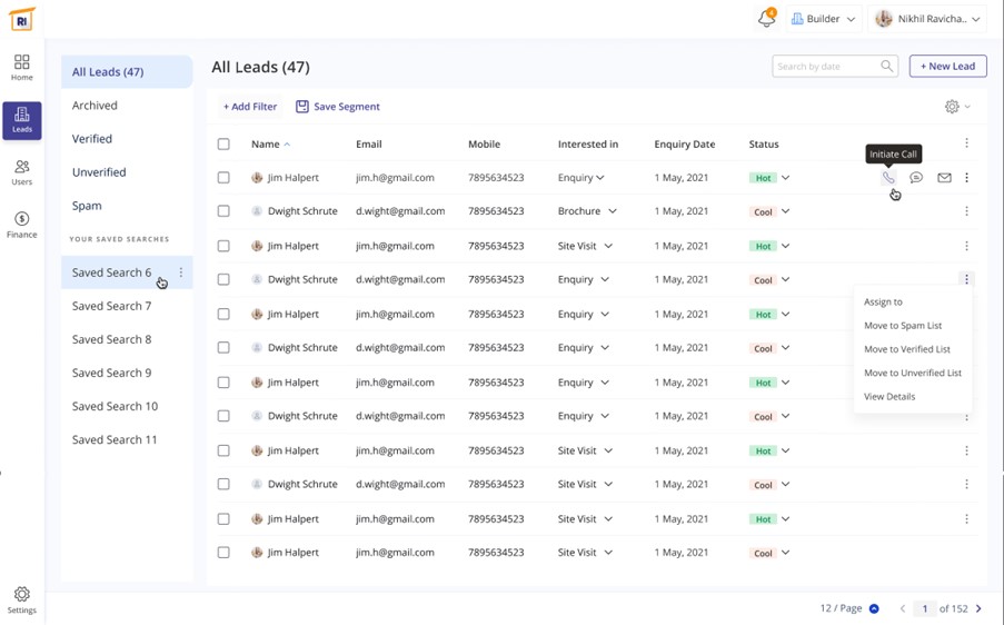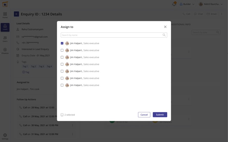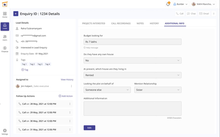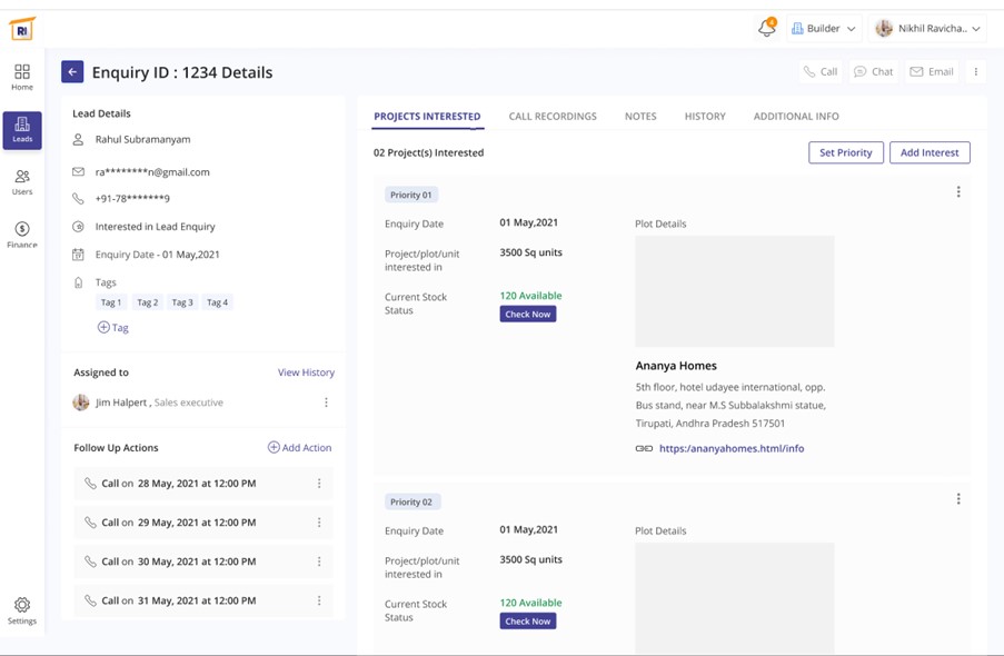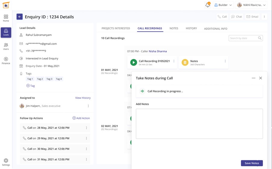 • The broker can call, text, or email the lead directly from the platform. The builder can also access the call recordings and discussions done with the lead if the broker-in-charge has granted access to the same.