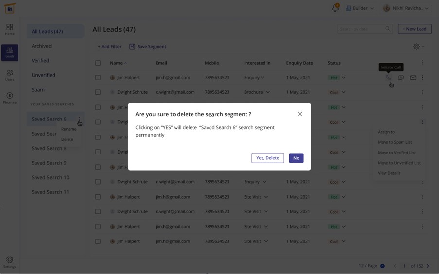 • On clicking the vertical three dots that is present at the end of each lead, the following activities gets opened up for the builder and broker