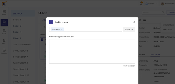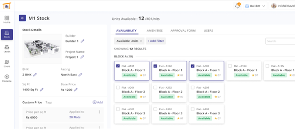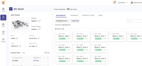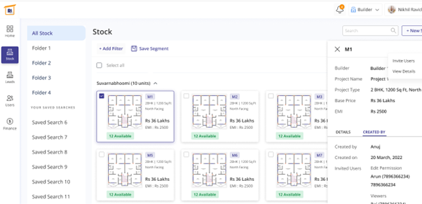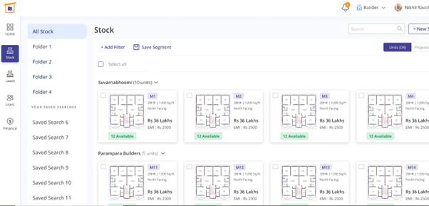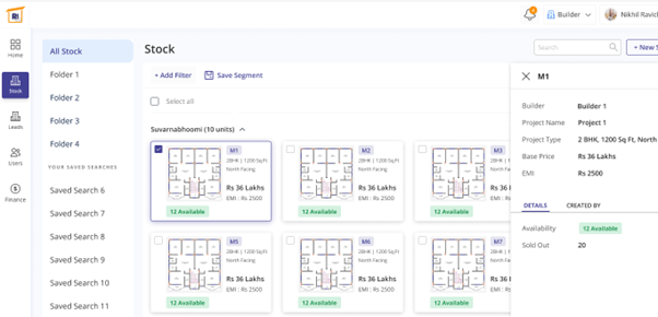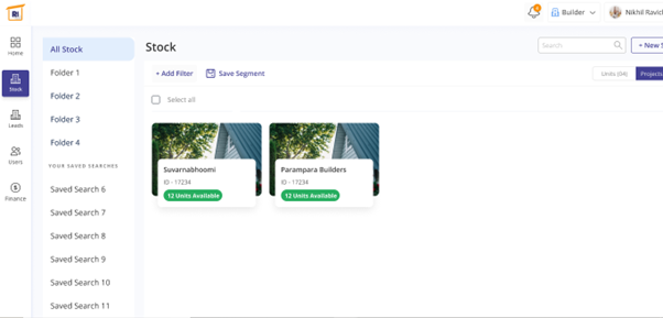 In the left pane, select stock and under ‘All stock’ you will find different folders to be added. This also shows the unit view of properties. In the top right-hand side there’s a tab near the search bar named ‘new stock’ which when clicked could let you add new properties in the list. In the sample, you can find Suvarnabhoomi containing 10 units and Parampara builders containing 5 units. This page shows the unit-wise availability of the properties.