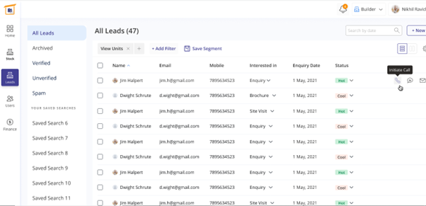 Select the leads on the left pane, you will get the lead counts along with their details. You will the names of the leads, their email id, contact number, what they are interested in - brochure, enquiry, site visit, call back, etc. It also provides the date of the lead enquiry and their current status on whether they are opened, closed or in progress. You can also initiate calls directly from the system or send texts or emails from the CRM-like software in place.