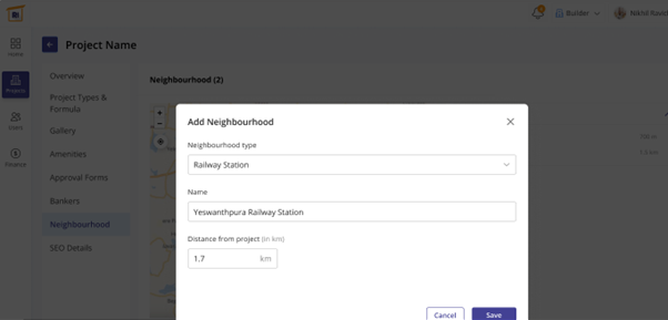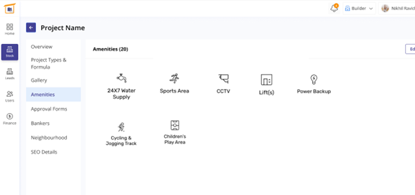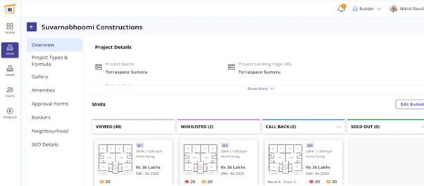 If you click on one of the projects, for e.g. Suvarnabhoomi, it displays several factors such as overview, project types and formulas, gallery, amenities, approval forms, bankers, neighbourhood, SEO details to be filled in. the overview shows the project details brief. It also provides information such as how many people have viewed the project, how many have wishlisted to buy one, the number of people asked for a call back and the number of units sold.