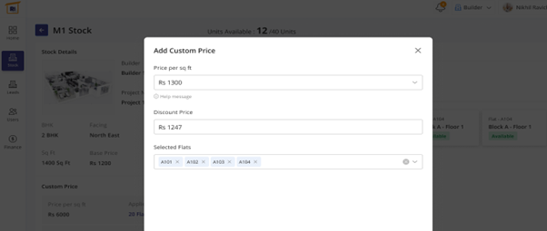 This shows the sample property details, along with the editing and viewing rights provided for the stakeholders. You can choose 2 or more blocks of the same type and add custom pricing along with discount prices for the property.
